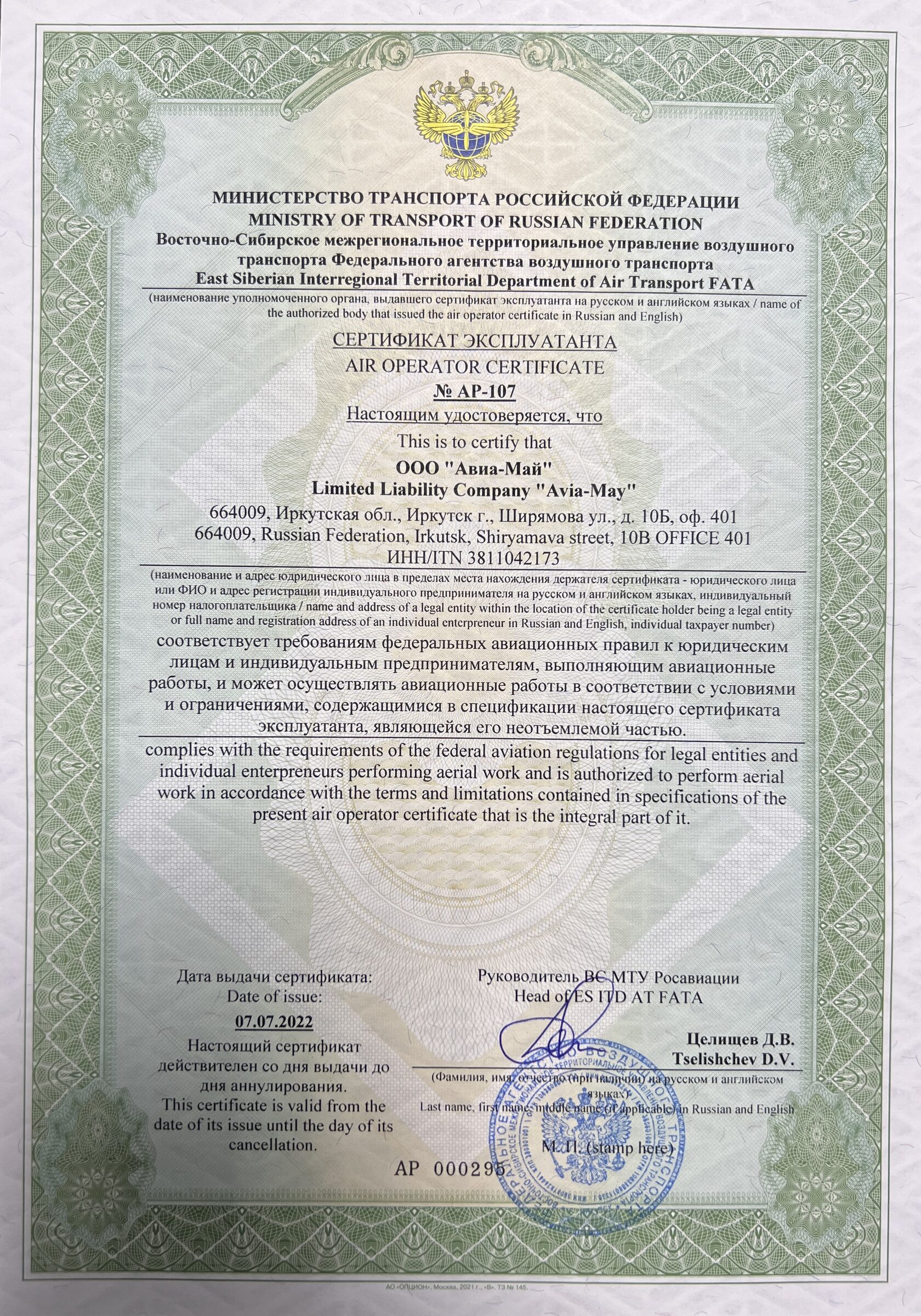 Также компания "Авиа-Май" соответствует требованиям воздушного законодательства Российской Федерации и может осуществлять авиационные виды работ, такие как: Воздушная съемка и Лесоавиационные работы.