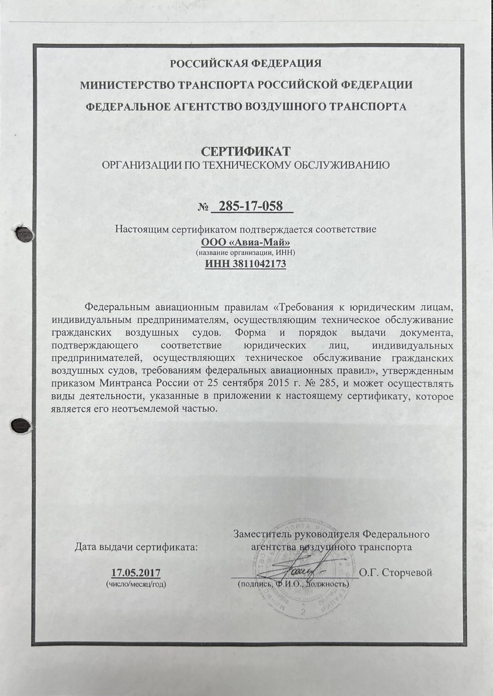 Компанией "Авиа-Май" получен сертификат №285-17-058 от 17 мая 2017г. организации по техническому обслуживанию.